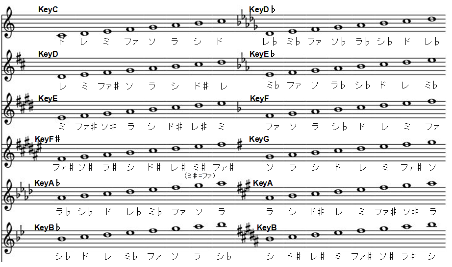 要するに、「ド」・「ド♯」・「レ」・「レ♯」・「ミ」・「ファ」・「ファ♯」・「ソ」・「ソ♯」・「ラ」・「ラ♯」・「シ」以上のすべての位置から始まる「ドレミファソラシド」があると覚えてください。