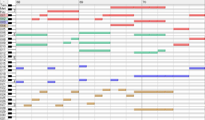ピアノロール形式の場合、音の長さや高さ、リズムなどが一目瞭然でわかるので、音符形式で楽譜を作るよりもかなりとっつきやすいです。何よりコピペが楽です。(すごく大事!)